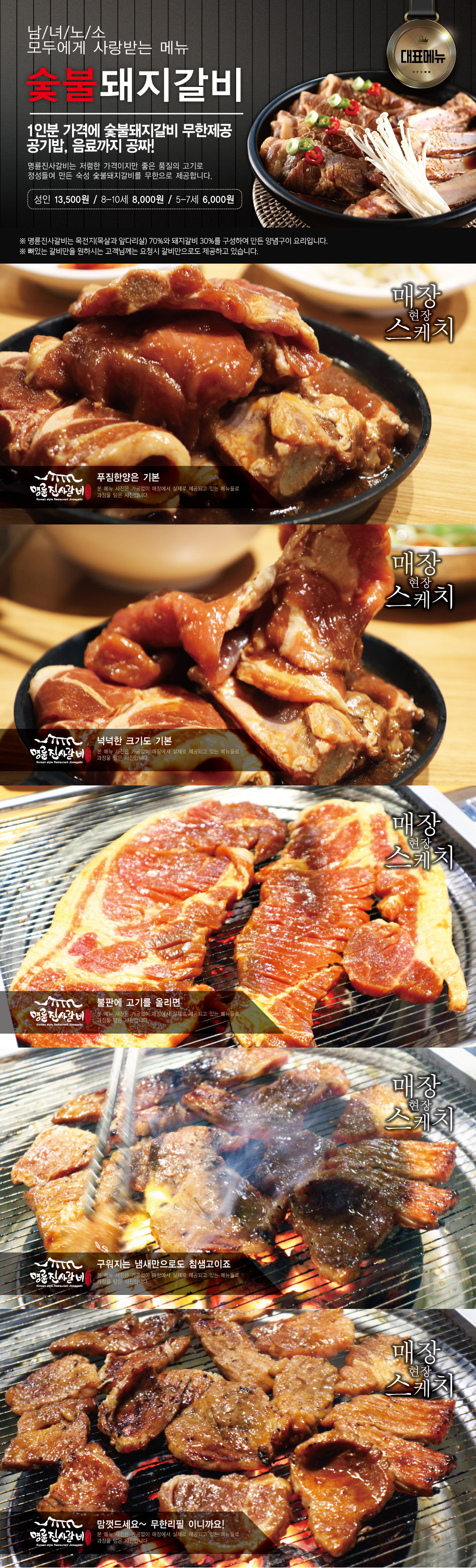 명륜진사갈비는 목전지(목살과 앞다리살) 70%와 돼지갈비 30%를 구성하여 만든 양념구이 요리.
