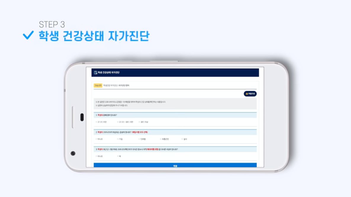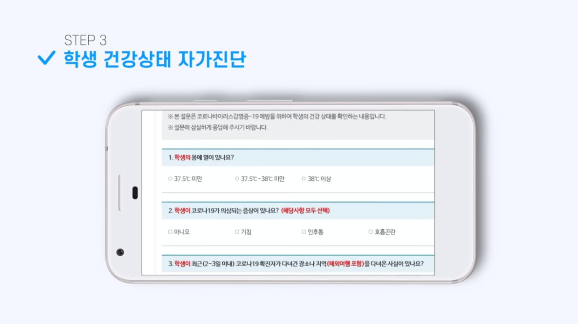 2단계로 6월 3일 개학을 앞두고 있는 고1과 중2 초등학교3,4학년은 5월 27일 수요일 부터 학생건강상태 자가진단 시스템에서 건강상태를 체크해야 합니다.