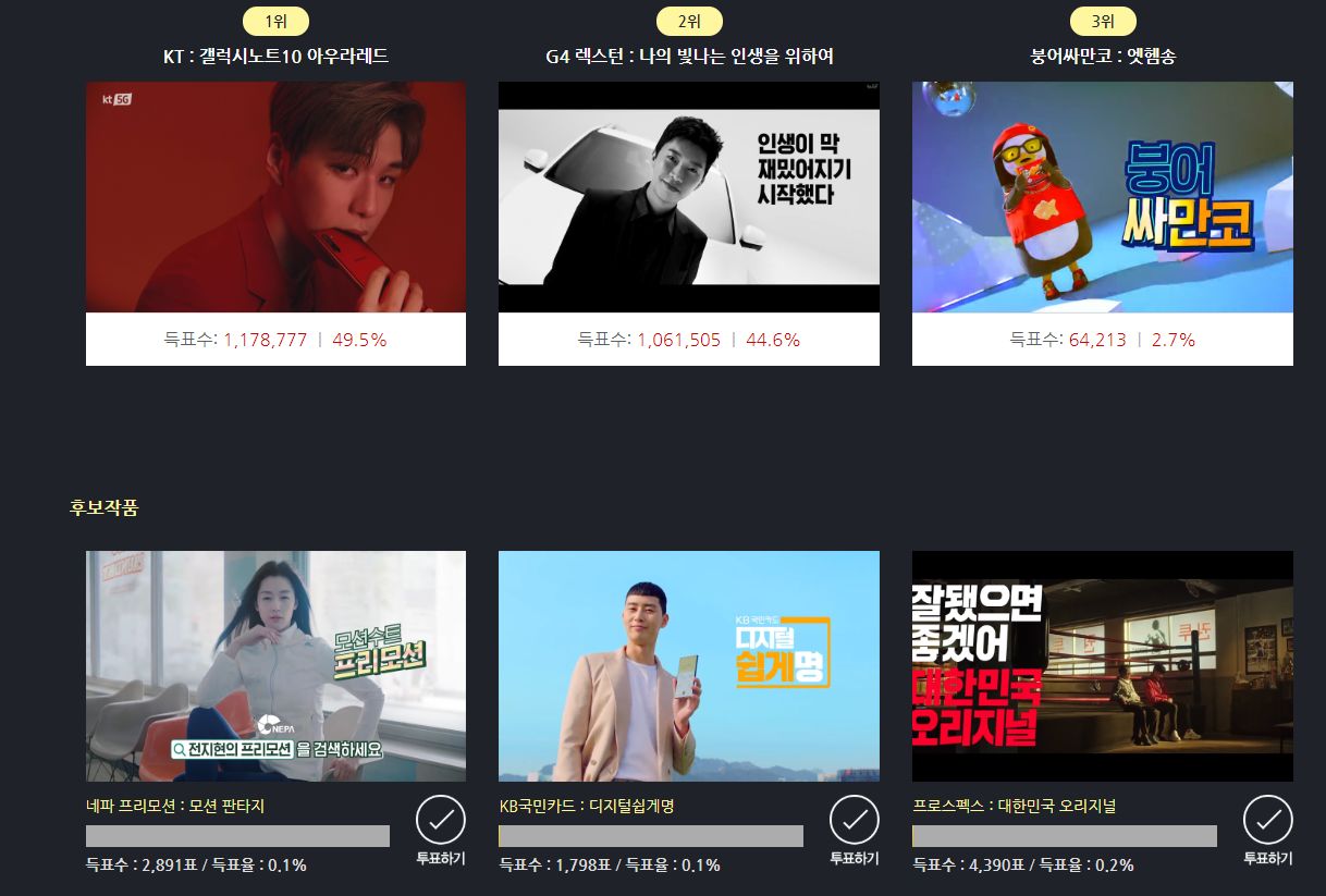 현재 6월 26일 금요일 , 강다니엘에 출연한 KT 갤럭시노트10 아우라레드 작품의 득표가 1,178,777표 이고, 2위는 임영웅이 출연한 G4렉스턴 : 나의 빛나는 인생을 위하여 입니다. 1,061,505표를 득표하고 있습니다.