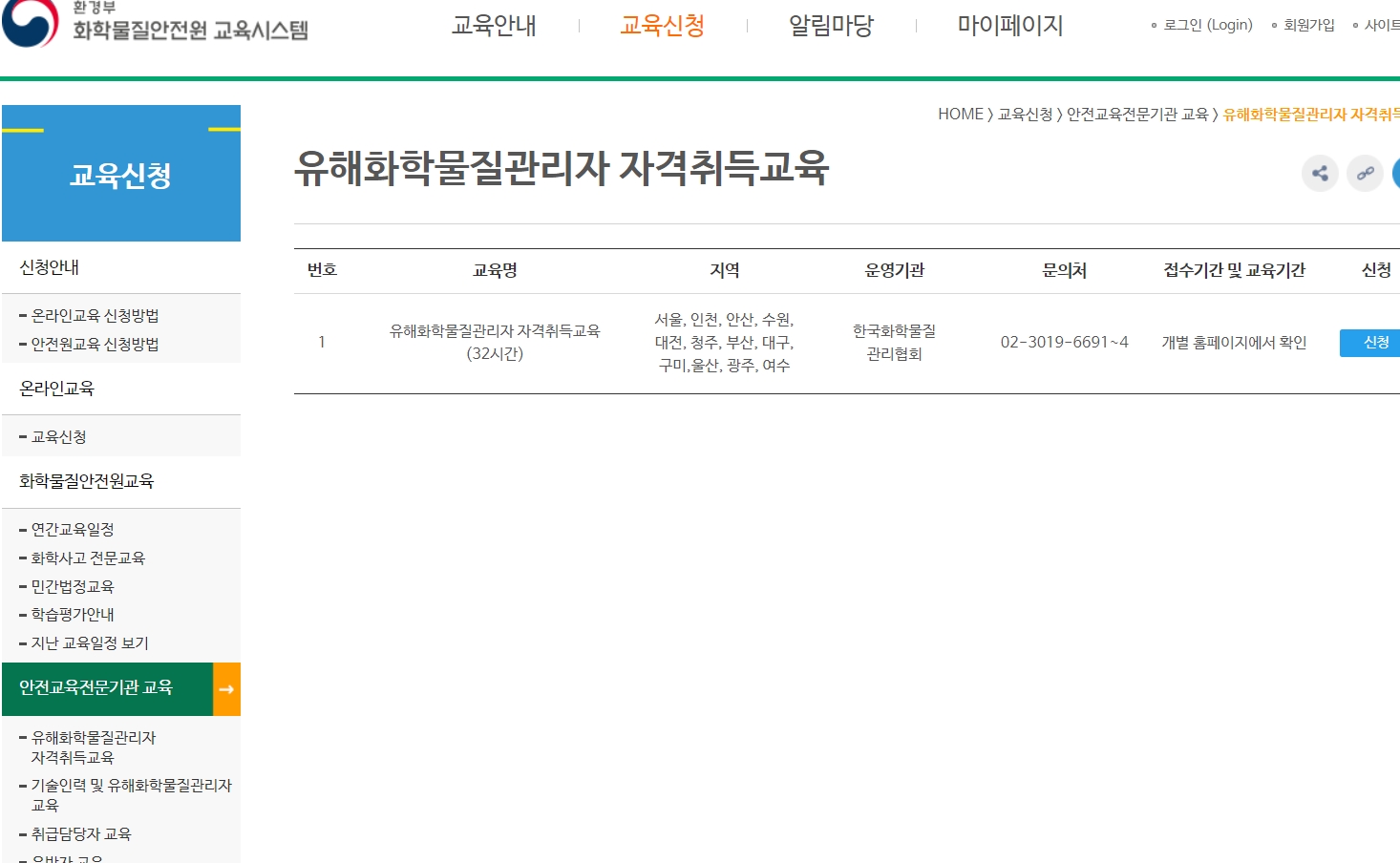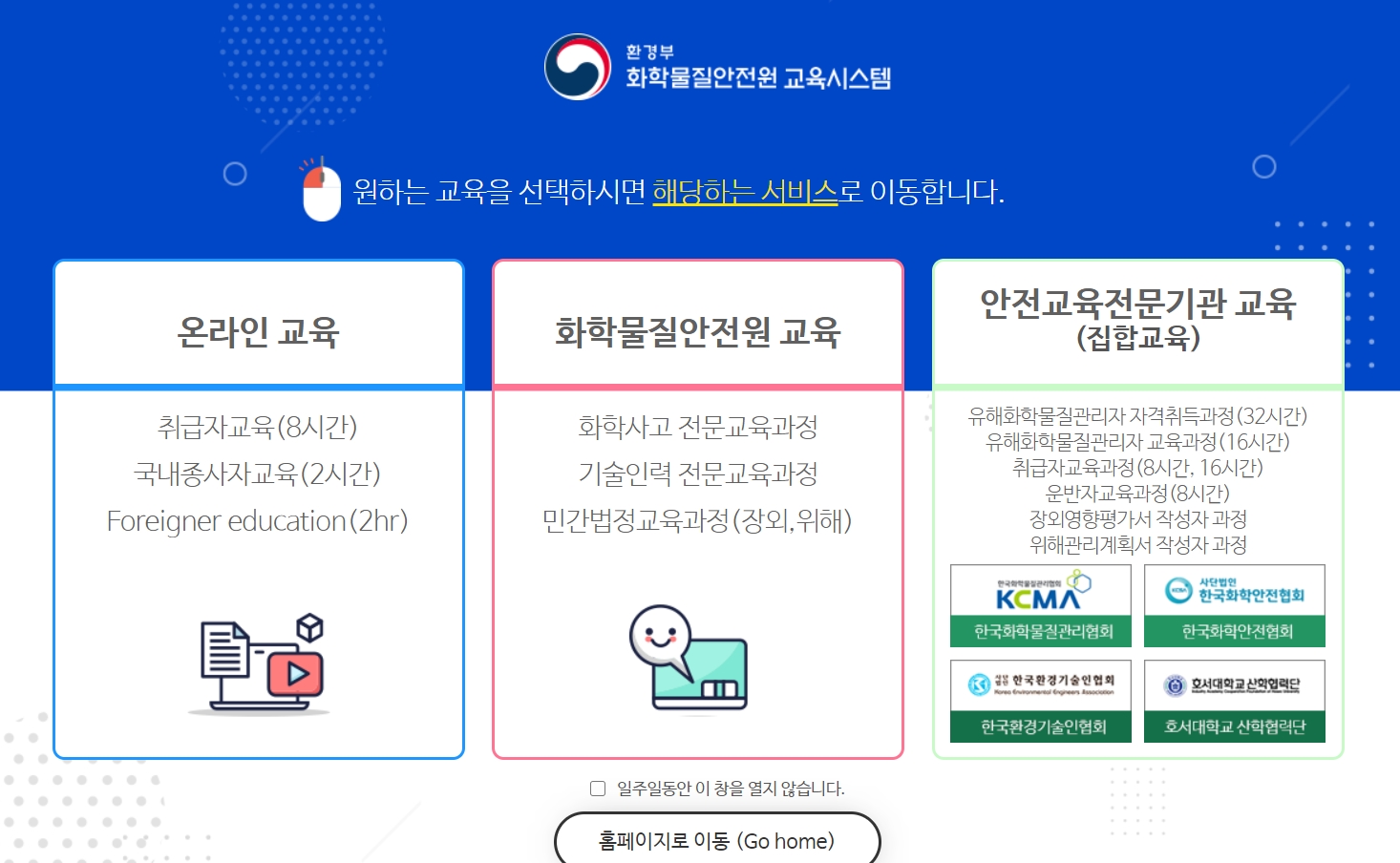 환경부 화학물질안잔원 교육시스템 : 원하는 교육을 선택하시면 해당 서비스로 이동합니다.