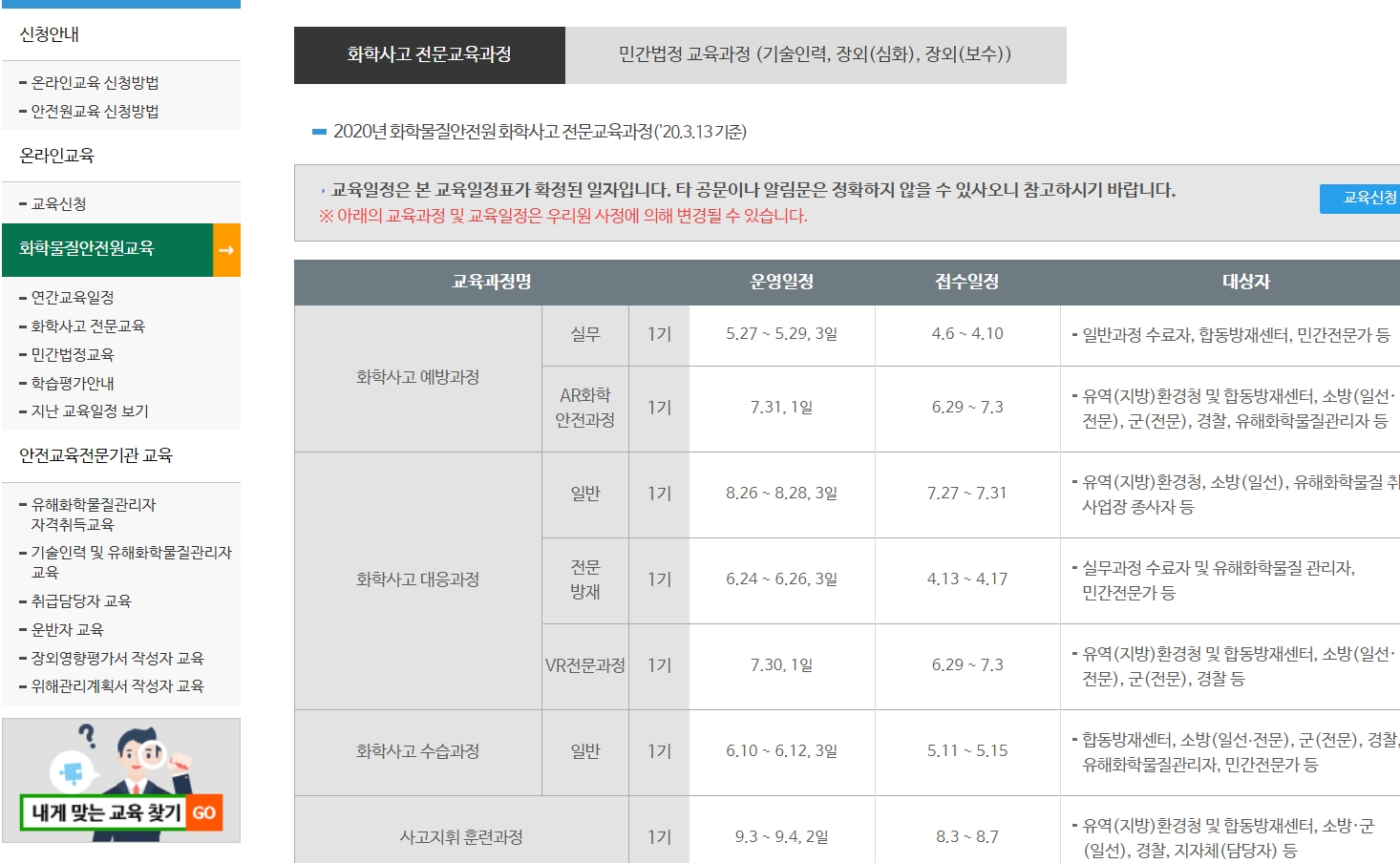 2. 화학물질안전원 교육 - 화학사고 전문교육과정, 기술인력 전문교육과정, 민간법정교육과정 (장외, 위해)