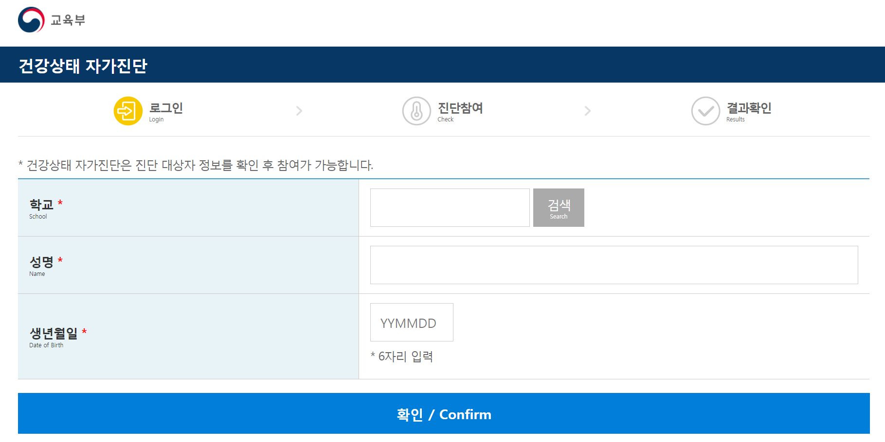 웹사이트에서의 접속 후 사용방법은 기존과 동일합니다. 학교와 성명 생년월일을 입력해서 본인 확인 후 진단참여를 하시면 됩니다.