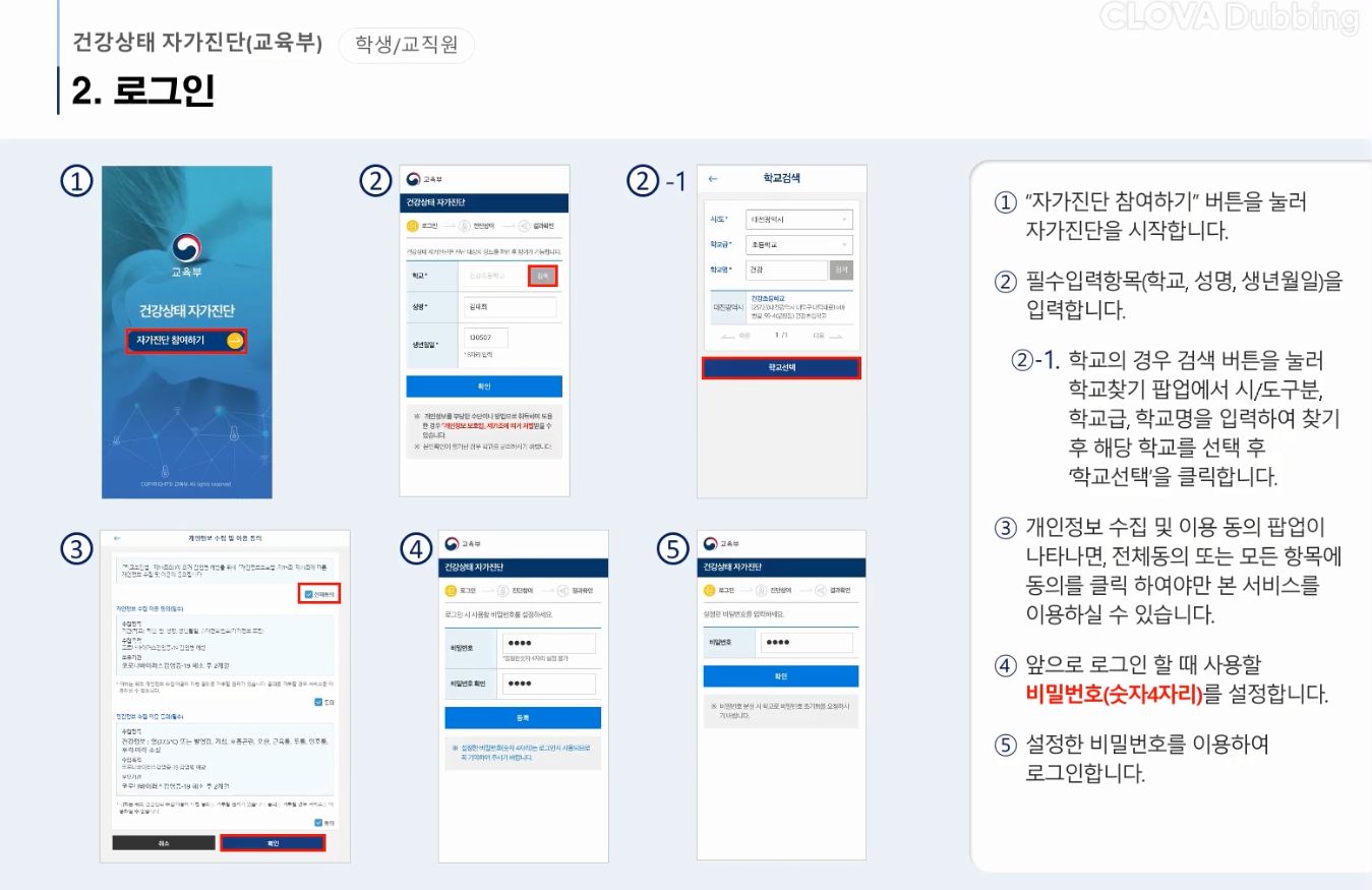 최초 로그인을 하시면 비밀번호 설정을 해주시기 바랍니다. (숫자 4자리) 이후 자가진단을 하실 때 이 비밀번호만 입력해서 로그인을 쉽게 할 수 있습니다.