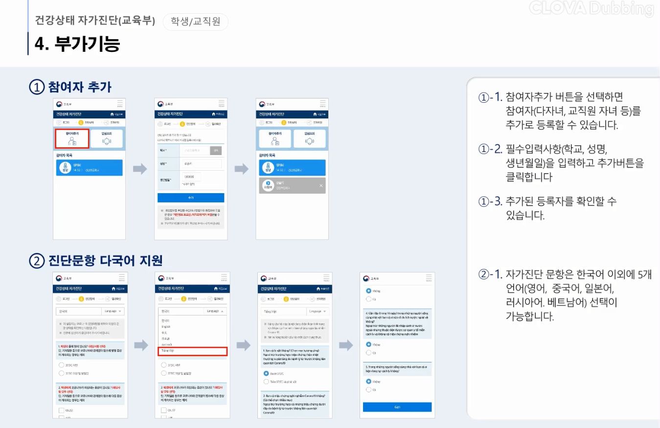진단은 열이 있는지 여부와, 코로나 증상이 있는지, 자가격리하는 동거 가족이 있는지, 본인 혹은 동거가족 중 최근 14일 이내 해외여행 혹은 체류사실이 있는지 등에 대한 동일한 질문입니다.