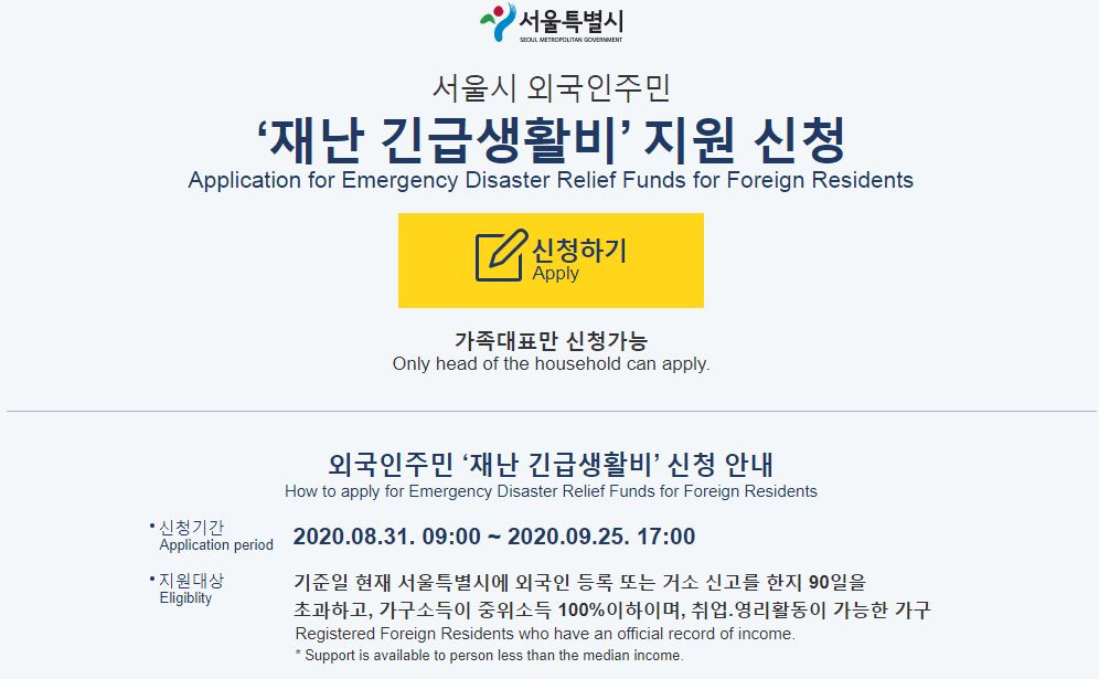 지원대상 Eligiblity 기준일 현재 서울특별시에 외국인 등록 또는 거소 신고를 한지 90일을초과하고, 가구소득이 중위소득 100%이하이며, 취업.영리활동이 가능한 가구 Registered Foreign Residents who have a