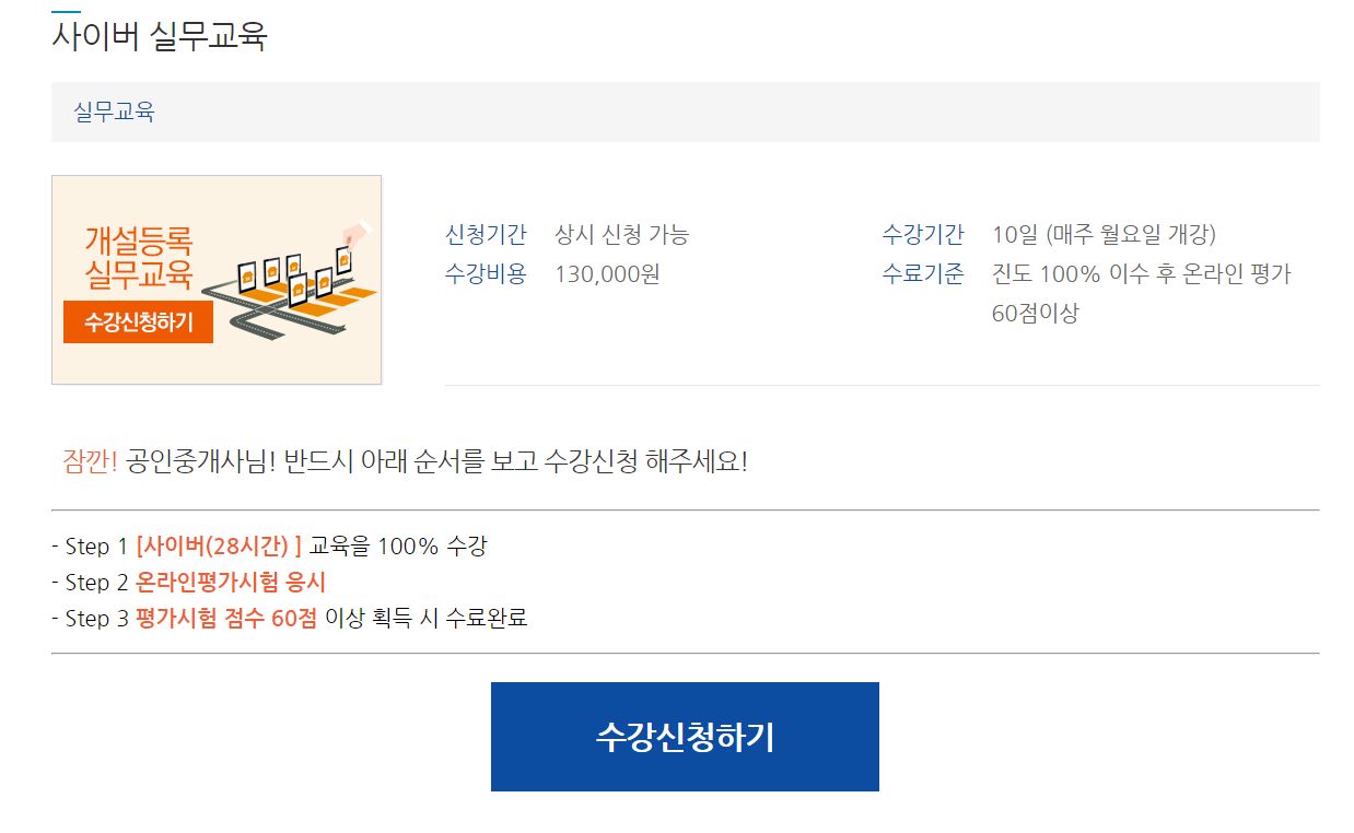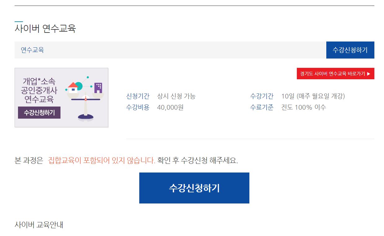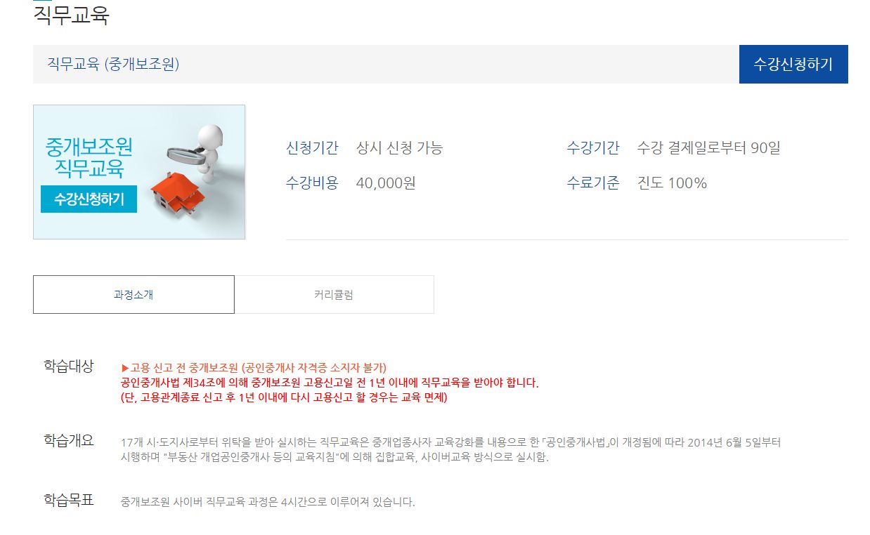 상시 신청 가능한 중개보조원 직무교육은 수강비용 40,000원 입니다.