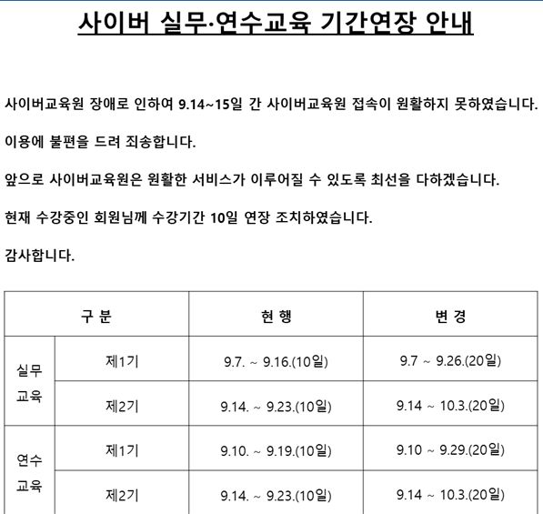 한국공인중개사협회 사이버교육원 장애로 14~15일 접속이 원활하지 못하여 수강회원분들에게 10일 동안 기간을 연장해 드렸다고 합니다. 이용하시는 분들 변경기간 확인하시기 바랍니다.