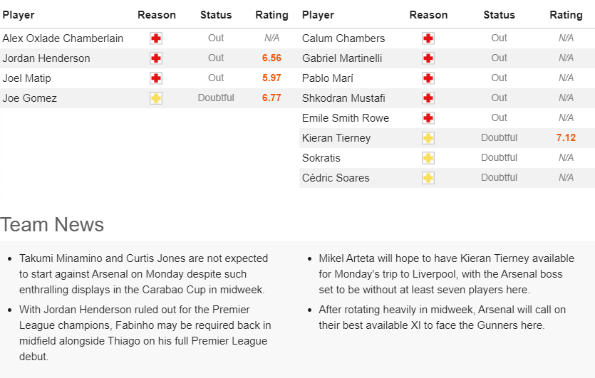 조던헨더슨이 부상으로 전력외로 분류되었습니다. 뮌헨에서 이적해 온 티아고의 풀타임 경기를 아스날전에서 볼 수 있을 것으로 보여집니다.