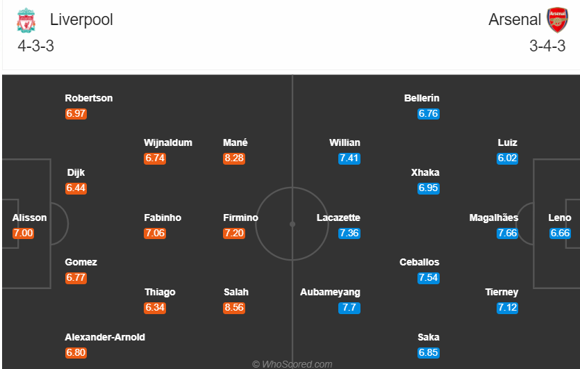 리버풀 4-3-3 : 알리송, 로버슨, 반다이크, 고메스, 알렉산더-아놀드, 바이날둠, 파비뉴, 티아고, 마네, 피르미누, 살라