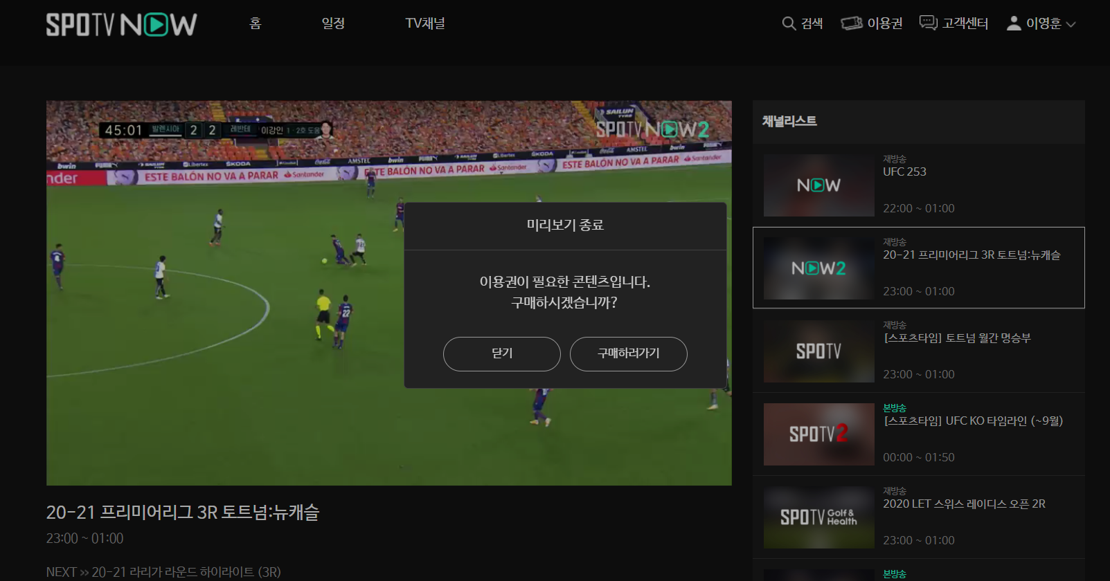 스포티비나우와 나우2채널은 유료회원만 시청할 수 있는 프리미어 서비스이지만 이강인 선수의 경기나, 손흥민 선수의 경기는 무료로 제공하고 있기 때문에 위와 같이 이용권이 필요한 콘텐츠라는 알림없이 경기 시청이 가능합니다. 경기 시작전 부터 무료로 접근이 가능합니다.