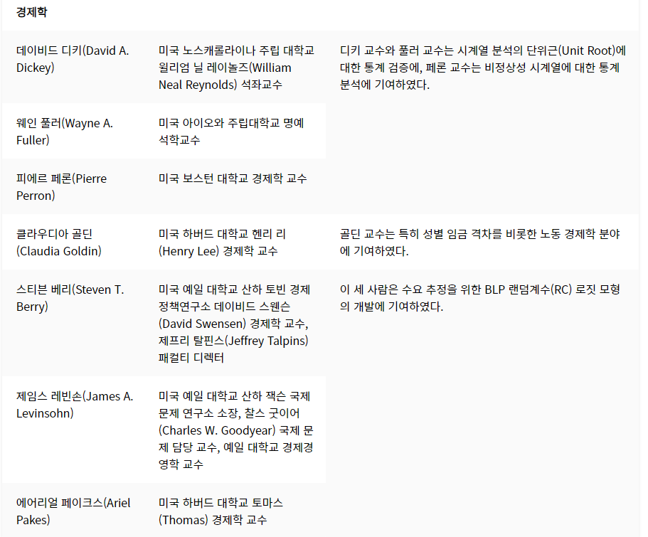 1. 데이비드 디키, 웨인풀러, 피에르 페론 - 디코 교수와 풀러 교수는 시계열 분석의 단위근에 대한 통계 검증에, 페론 교수는 비정상성 시계열에 대한 통계 분석에 기여하였다.