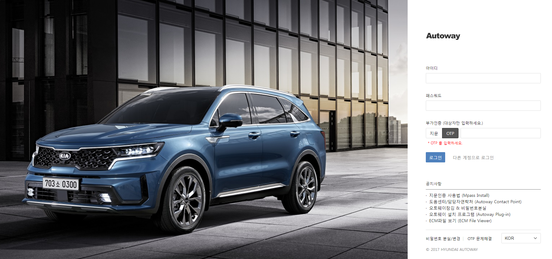 2020년 최신 현대자동차 오토웨이 사외접속 주소 바로가기 주소 = autoway.hmc.co.kr 아이디, 패스워드, 부가인증(대상자만, 지문 OR OTP) 공지사항 - 오토웨이 콜센터전화 및 ITSM문의 확인방법 오토웨이