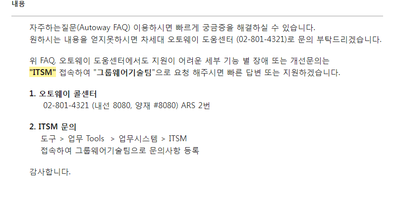 문제해결이 되지 않는 경우 ITSM 접속 후 그룹웨어기술팀으로 요청