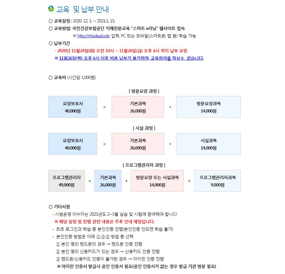 마음까지 보살피는 국민건강보험 노인장기요양보험 2020년 치매전문교육 교육대상자 교육비 납부 사이트를 안내드리겠습니다. 또한 교육이 진행되면 사이버교육을 수강해야 하는 사이트도 하단에 링크 해드리니 필요하신 분들은 참고하시기 바랍니다.
