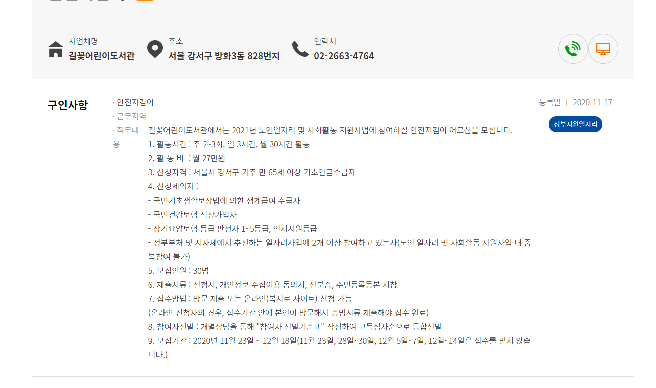 안전지킴이 라는 사업은 주 2-3회, 일 3시간 , 월 30시간 활동을 하는 일자리로 활동비는 월 27만원 입니다. 신청자격은 강서구 거주 만 65세 이상 기초연금수급자 대상으로 모집인원은 30명 입니다.