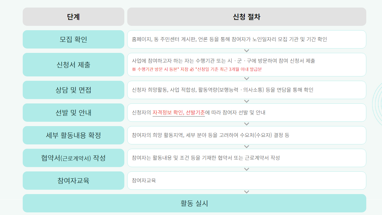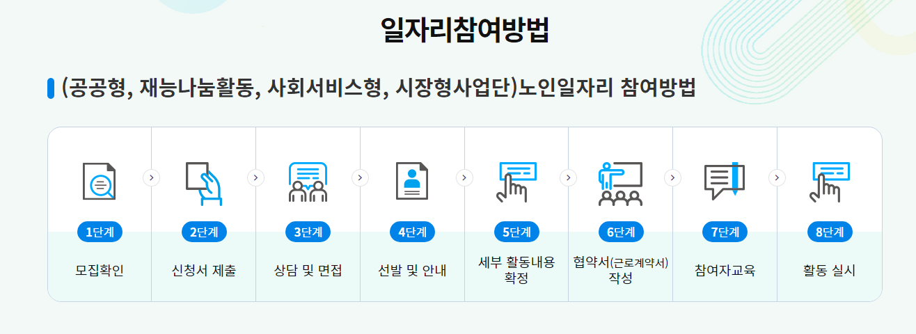 모집확인 - 신청서 제출 - 상담 및 면접 - 선발 및 안내 - 세부 활동내용 확정 - 협약서 (근로계약서 작성) - 참여자 교육 - 활동 실시