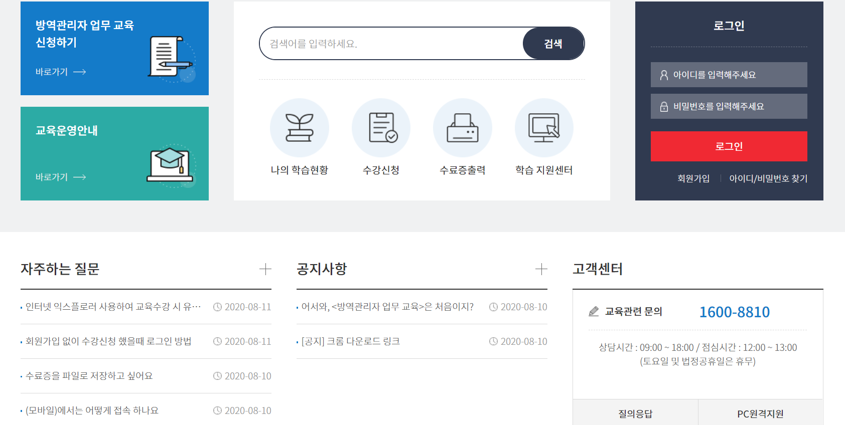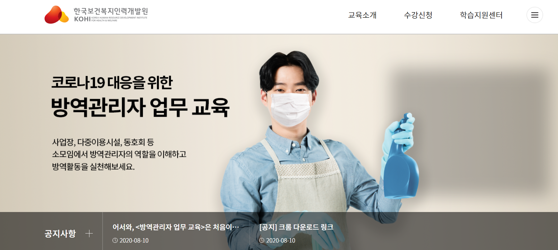 공지사항 어서와, <방역관리자 업무 교육>은 처음이지? 2020-08-10 [공지] 크롬 다운로드 링크 2020-08-10 공지사항 더보기 방역관리자 업무 교육신청하기 교육운영안내