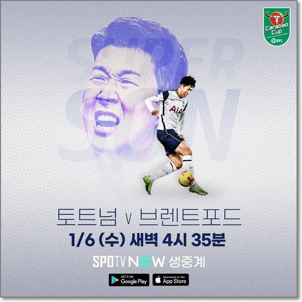 당연히 손흥민 선수의 선발출전경기이기도 할 것인 토트넘 핫스퍼 FC vs 브렌트퍼드 FC 카라바오컵4강 경기 6일 수요일 새벽 4시 45분 SPOTV NOW 에서 PC와 모바일 또 티비는 일반 채널 SPOTV를 통해 무료로 시청하실 수 있습니다.