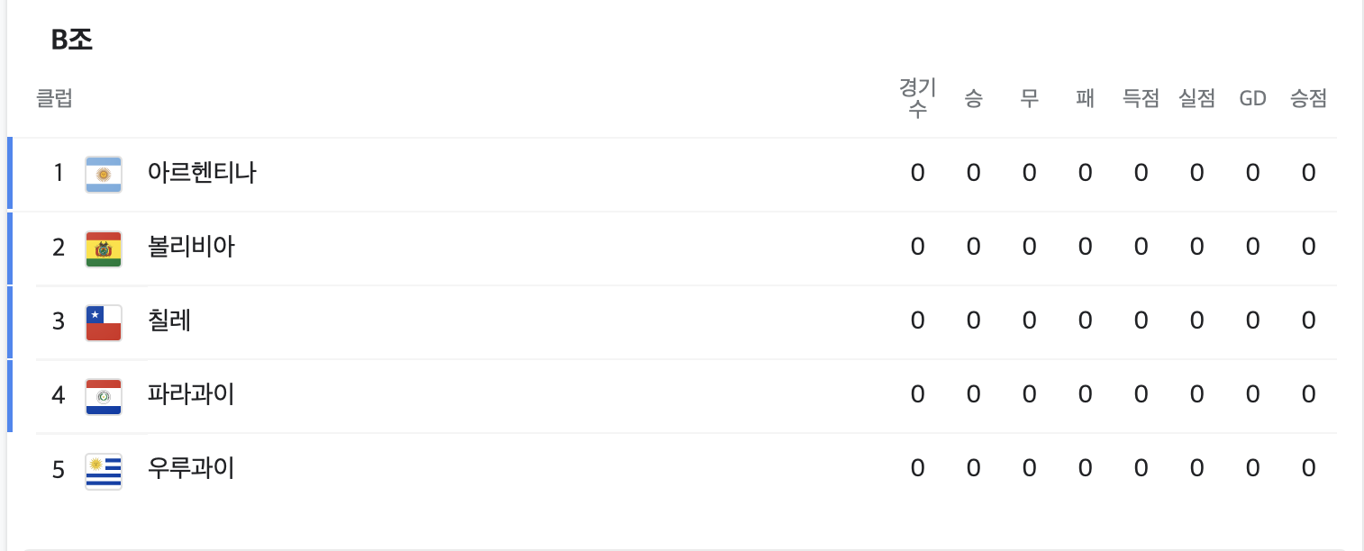 B조에는 개최국 아르헨티나, 볼리비아, 칠레, 파라과이, 우루과이가 한조로 역시 4개팀이 8강에 진출해 토너먼트를 벌이게 됩니다. 2개밖에 없는 조이지만 그래도 죽음의 조라면 B조 입니다.
