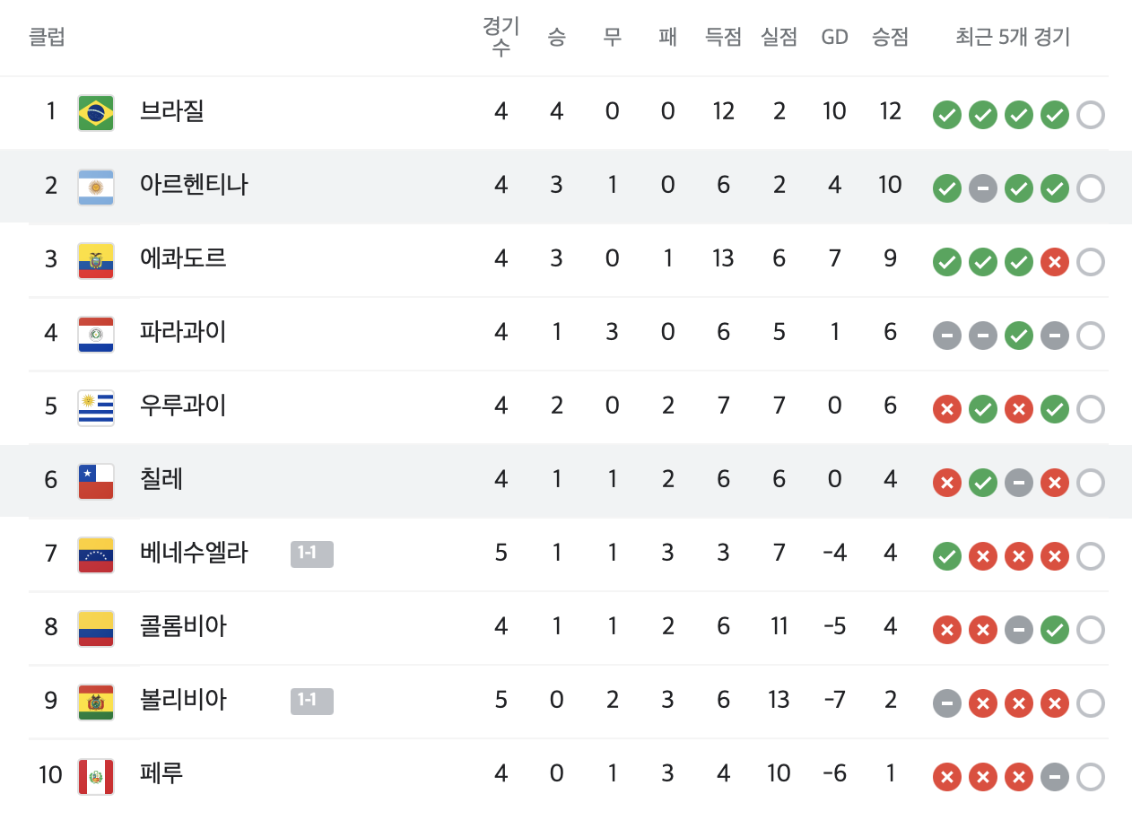 과거에는 홈극강으로 볼리비아 페루 역시 경쟁력 있는 경기를 해냈지만 세대교체에 실패하면서 자연스럽게 성적이 나오지 않고 있습니다. 브라질 아르헨티나 우루과이 에콰도르가 꾸준히 좋은 경기력으로 4경기밖에 치르지 않았지만 대충 월드컵 진출 윤곽이 나오고 있습니다.