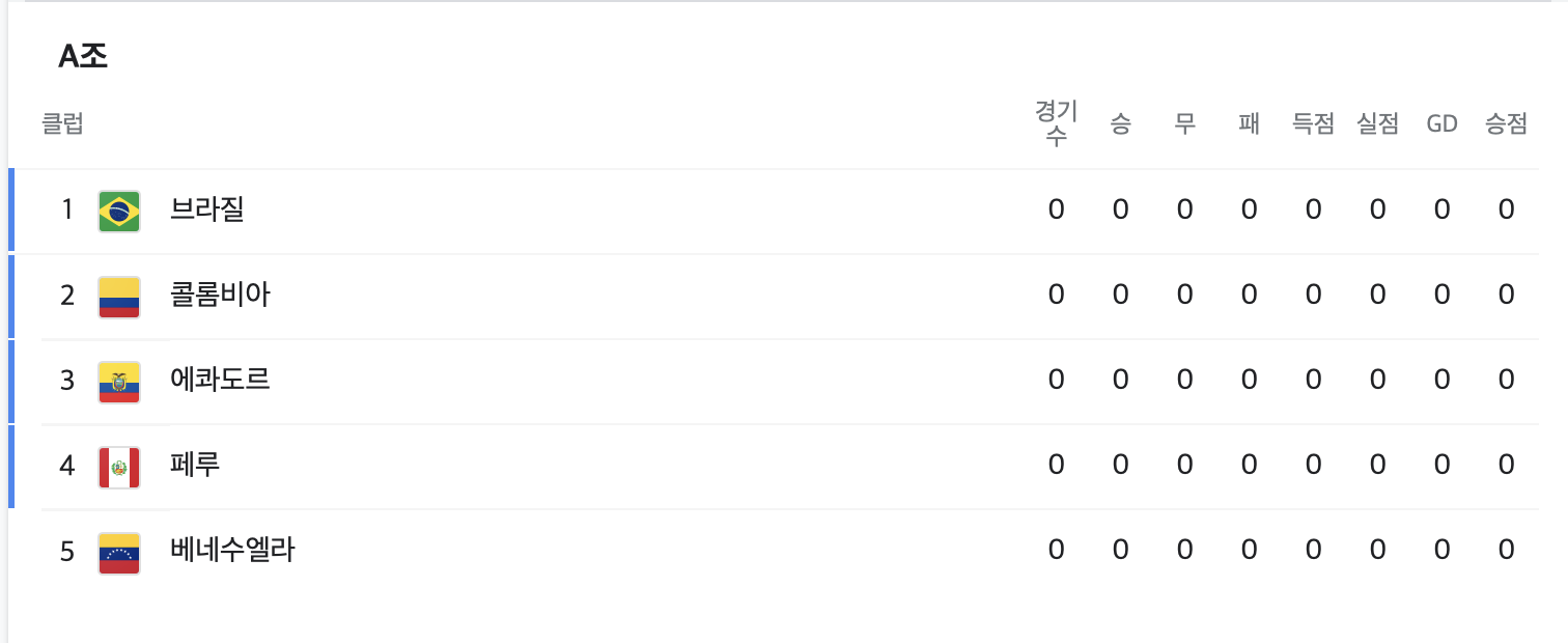 A조에는 브라질, 콜롬비아, 에콰도르, 페루, 베네수엘라가 속해 있고, 조별리그를 진행하고 상위 4개팀이 8강으로 진출합니다. A조에서는 브라질과 콜롬비아, 에콰도르와의 경기가 빅매치로 손꼽히고 브라질과 콜롬비아는 6월 23일 / 브라질과 에콰도르는 6월 27일 경기 예정입니다.