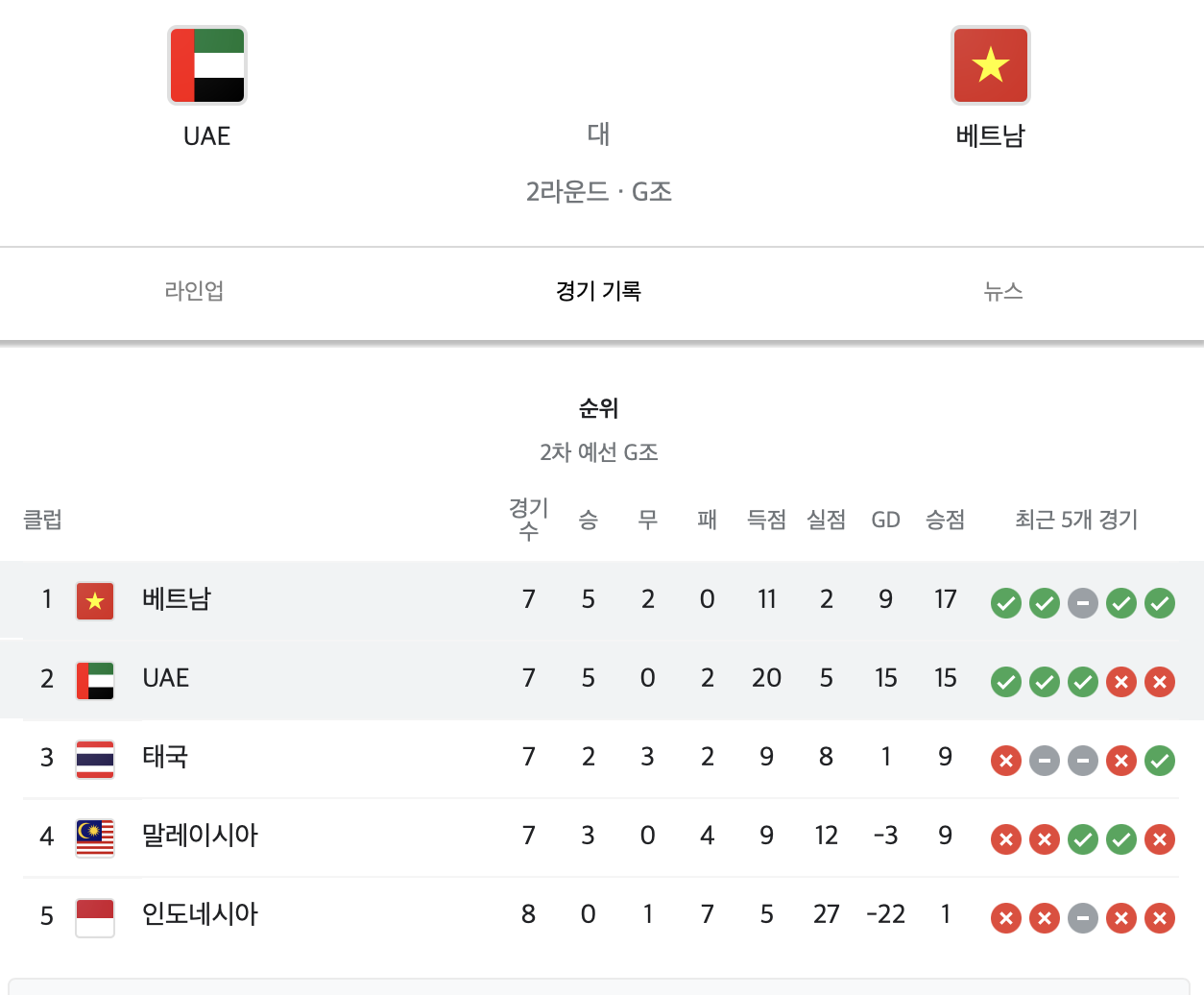 G조 1위는 베트남으로 5승 2무 승점 17점입니다. 그 뒤를 이어 아랍에미레이트가 5승 2패 승점 15점으로 베트남을 추격하고 있고 최종전에서 승점3점을 추가하면 순위를 바꿀 수 있습니다. 특히 승점 15점인 지금 인도네시아와의 2경기 승점 6점을 제외하고 나서 각조2위와의 승점 비교로 상위 팀이 최종예선에 올라가기 때문에 아랍에미레이트도 베트남전에서 승리를 하지 않으면 최종예선 진출을 장담하기 어려운 상황입니다.
