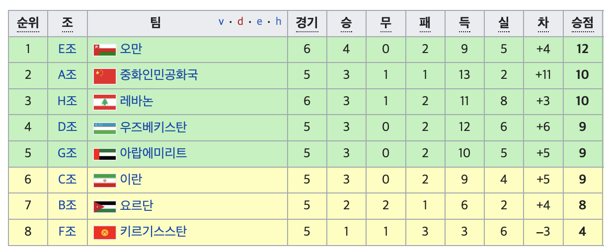 - 2022 카타르월드컵 아시아2차예선 조2위 승점