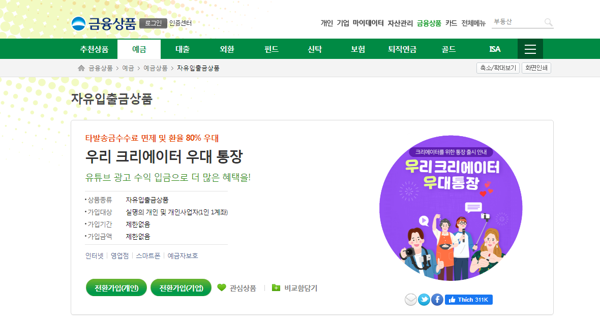 우리은행 자유입출금 상품 중 우리 크리에이터 우대 통장이라고 있습니다.
