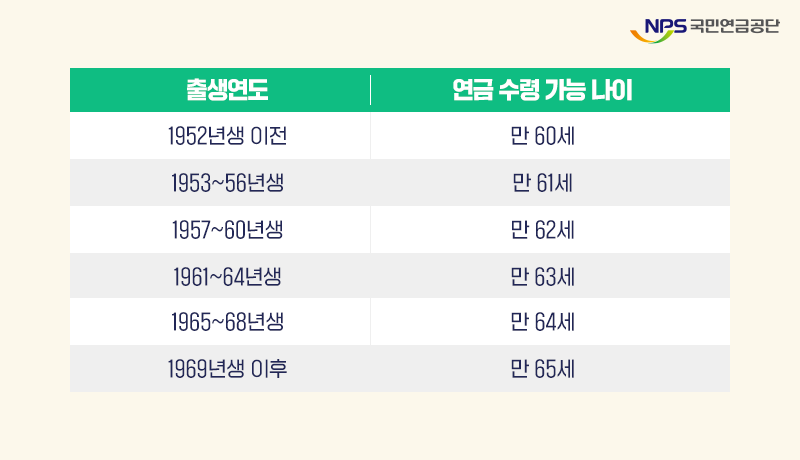 국민연금 수령 가능 나이 출생연도 (1952년생 이전 1953-56, 1957-60, 1961-64, 1965-68, 1969년생 이후)
