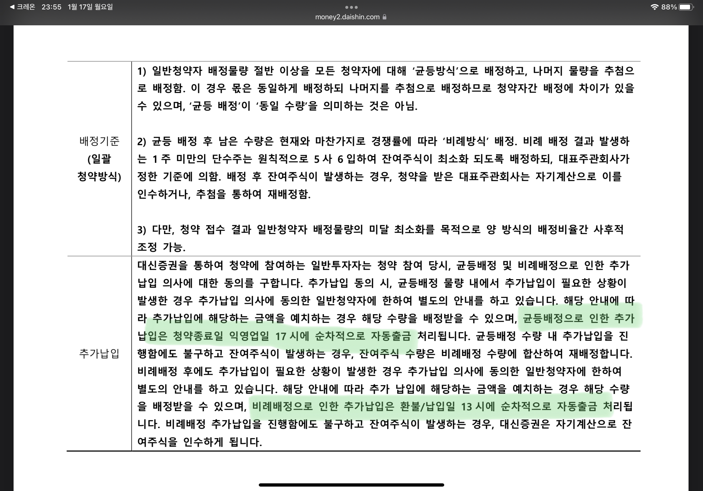 1. 균등배정으로 인한 추가납입은 청약종료일 익영업일 17시에 순처적으로 자동출금 처리 됩니다.