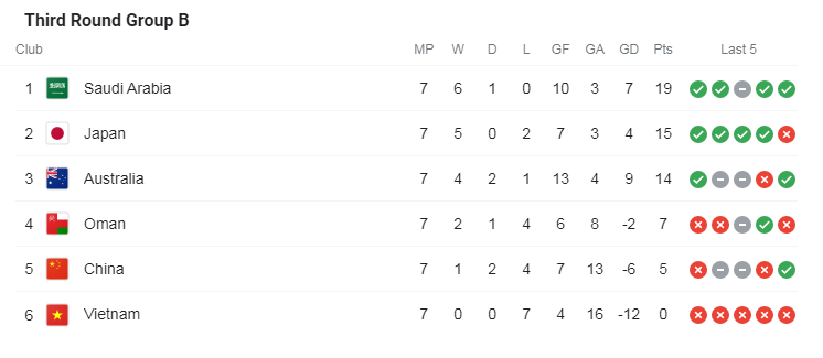 사우디아라비아 6승 1무 0패 승점19점 +7