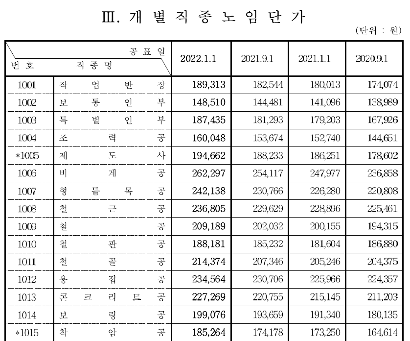 자료는 아래처럼 번호와 직종명 날짜별 노임단가를 확인하실 수 있습니다. 그리고 직종명에 대한 설명도 뒤에 첨부되어 있습니다.