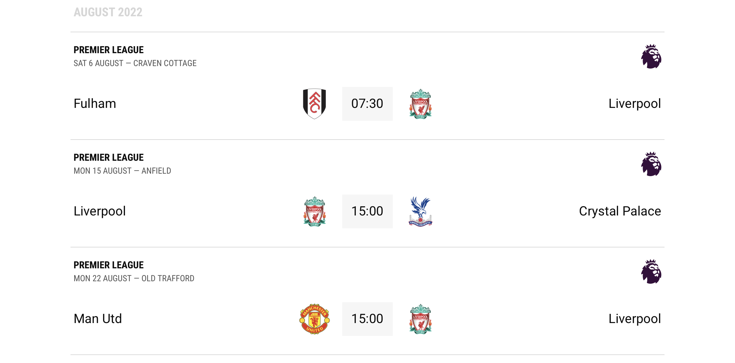 리버풀 홈 개막전은 8월 15일 15:00 크리스탈팰리스전이고