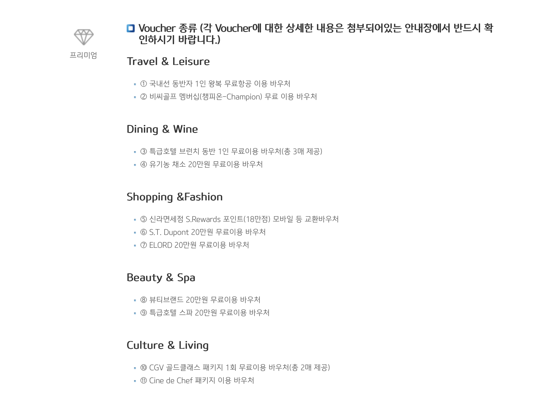 그리고 연회비 20만원에 상응하는 바우처를 제공해서 연회비를 상쇄하는 혜택을 주는데요 아래 12가지 중 1가지를 선택하시면 됩니다.