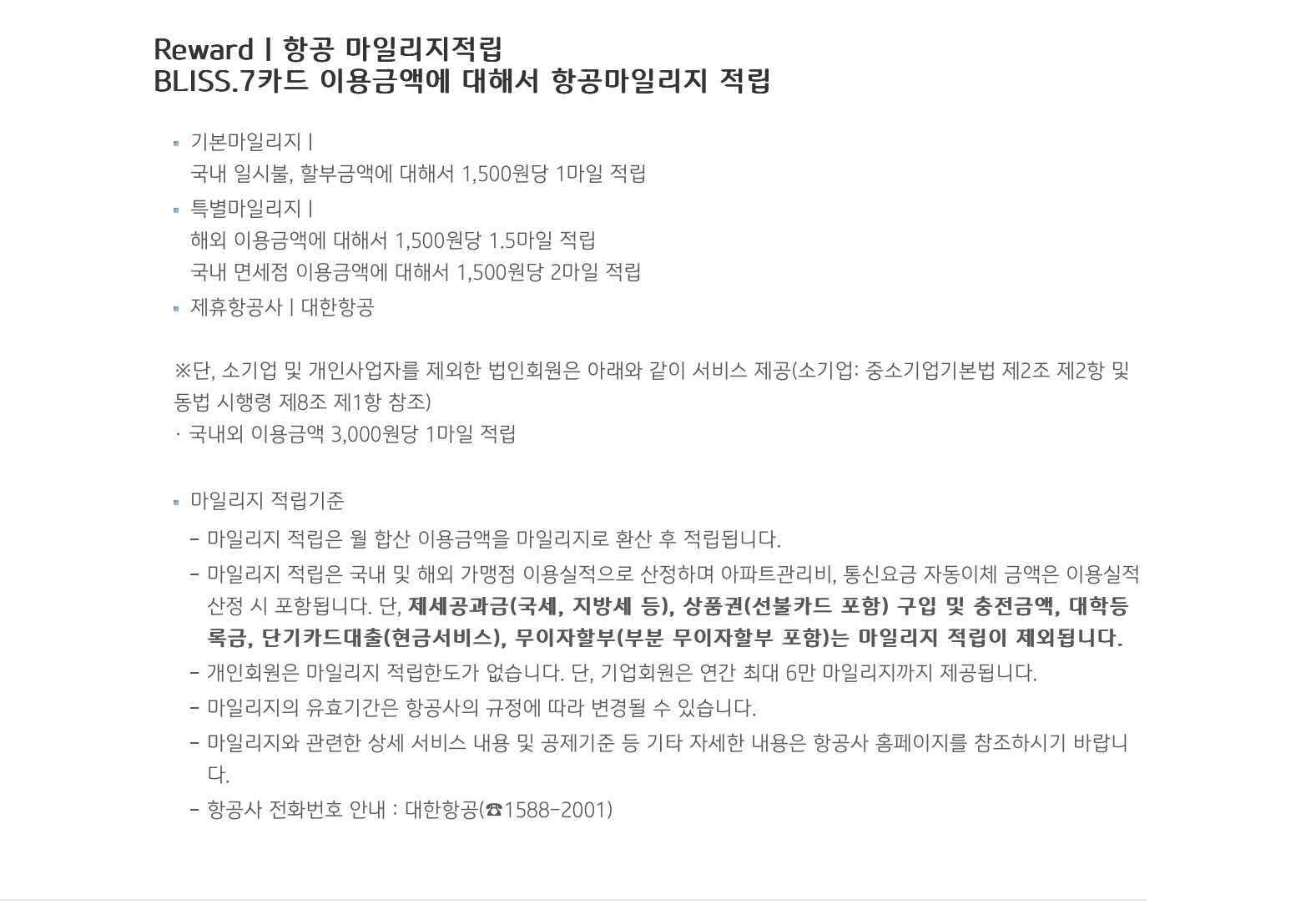 1500원당 1마일 기본 / 해외이용 시 1500원당 1.5마일, 국내 면세점 이용 시 1500원당 2마일 적립