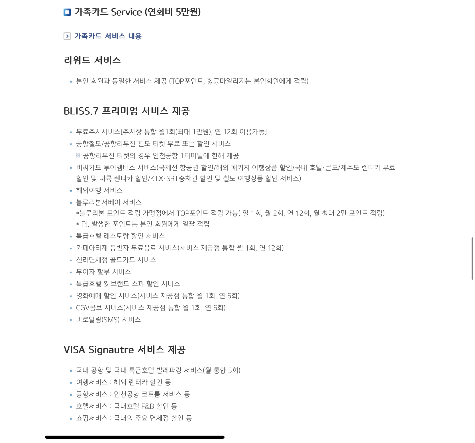 그리고 많은 분들이 헷갈려 하시는 부분 중 블리스5 카드가 PP카드는 발급되지만 카드사용금액에 따라 라운지 이용횟수 제한이 있어서 별도의 표시가 없는 블리스7도 그런게 아닌가 의구심을 가지지만 비자 시그니처로 발급되는 카드는 공항 라운지 무제한 이용 가능합니다.