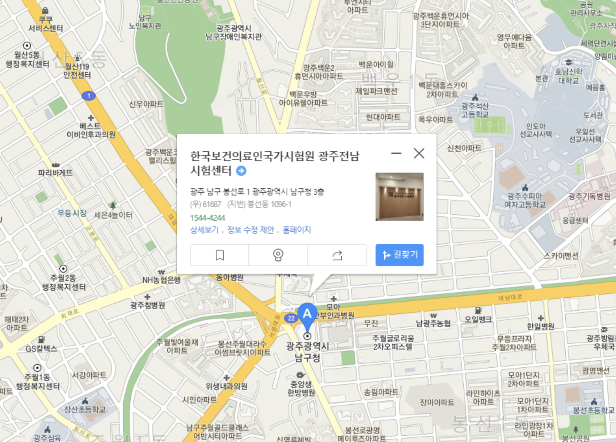 광주광역시 남구 봉선로 1 (봉선동) 광주광역시 남구청 3층 (시험장 내 대기공간 협소, 입장 시간 전 입장 불가)