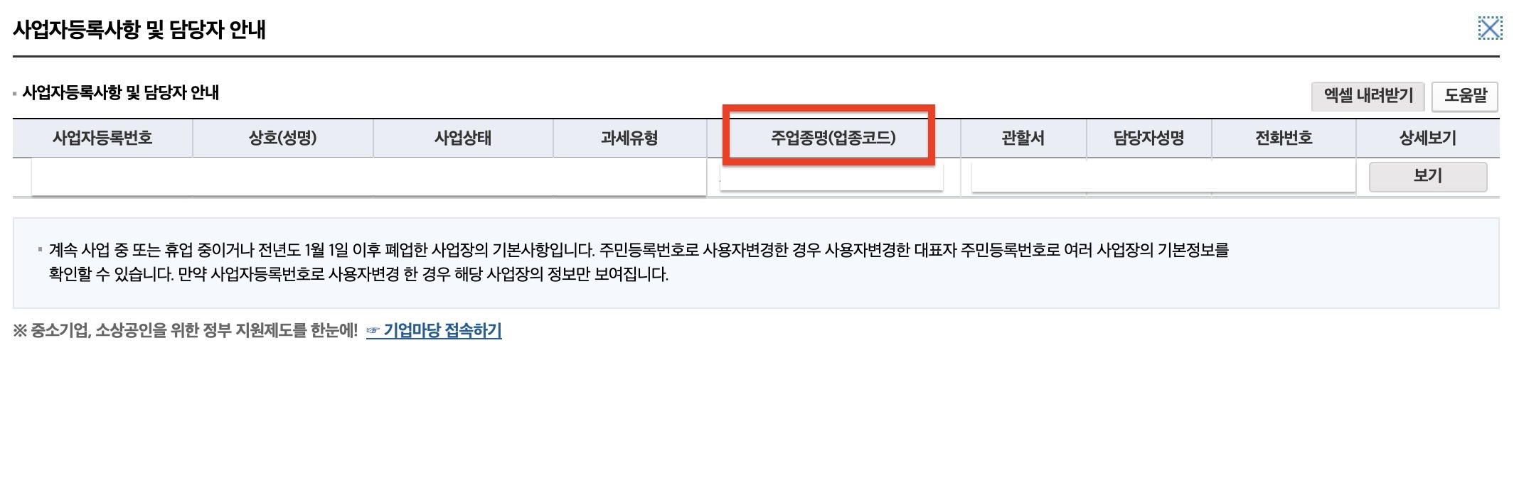이동한 페이지에서 사업자 등록사항 및 담당자 안내가 나오고요, 여기에 주업종명 (업종코드가 확인됩니다)