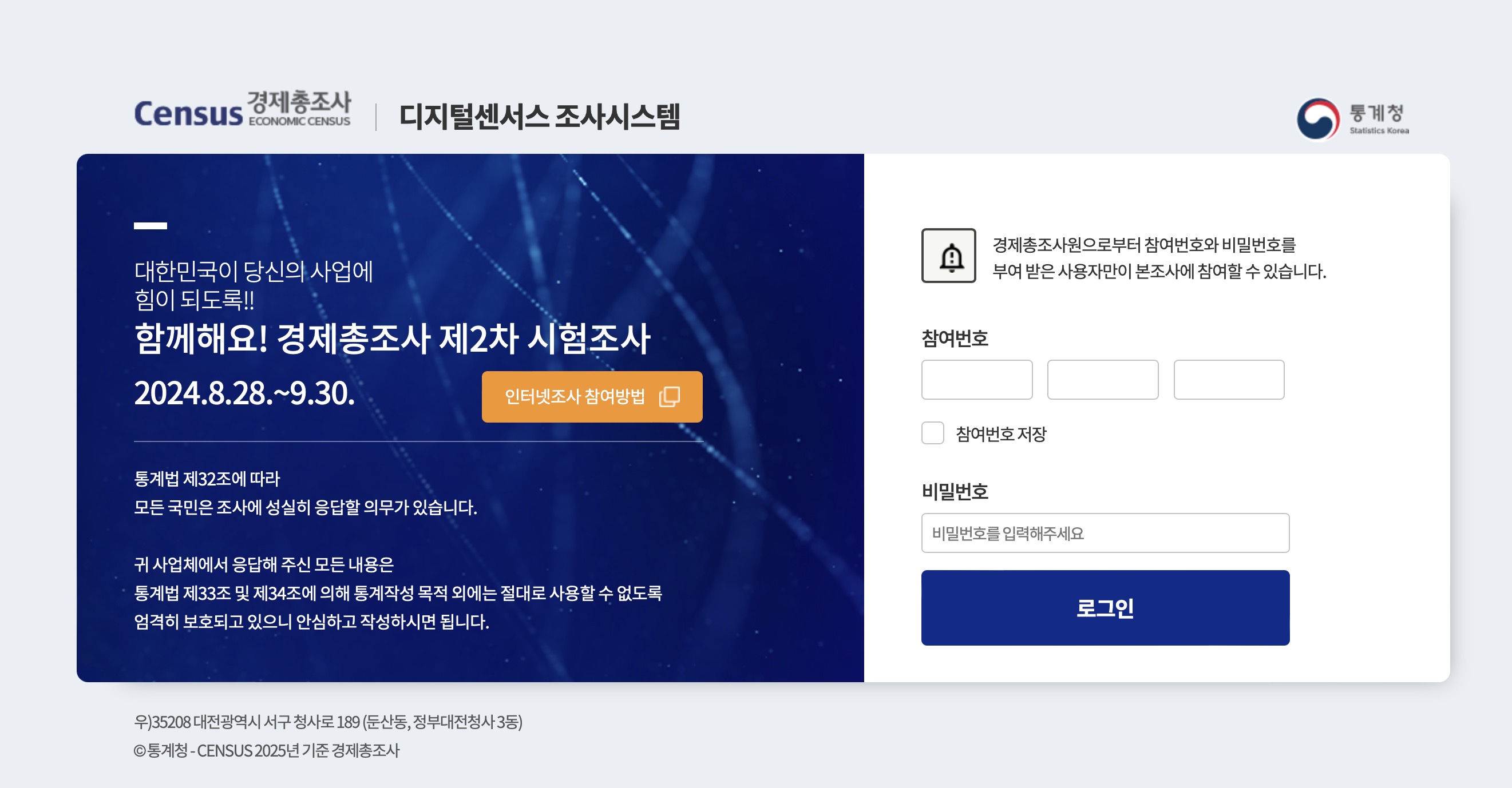 * 경제총조사원으로부터 참여번호와 비밀번호를 부여 받은 사용자만이 본조사에 참여할 수 있습니다.