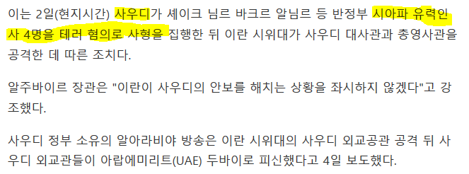사건 발단은 사우디가 자국 시아파 지도자 알님르를 처형하면서 시작